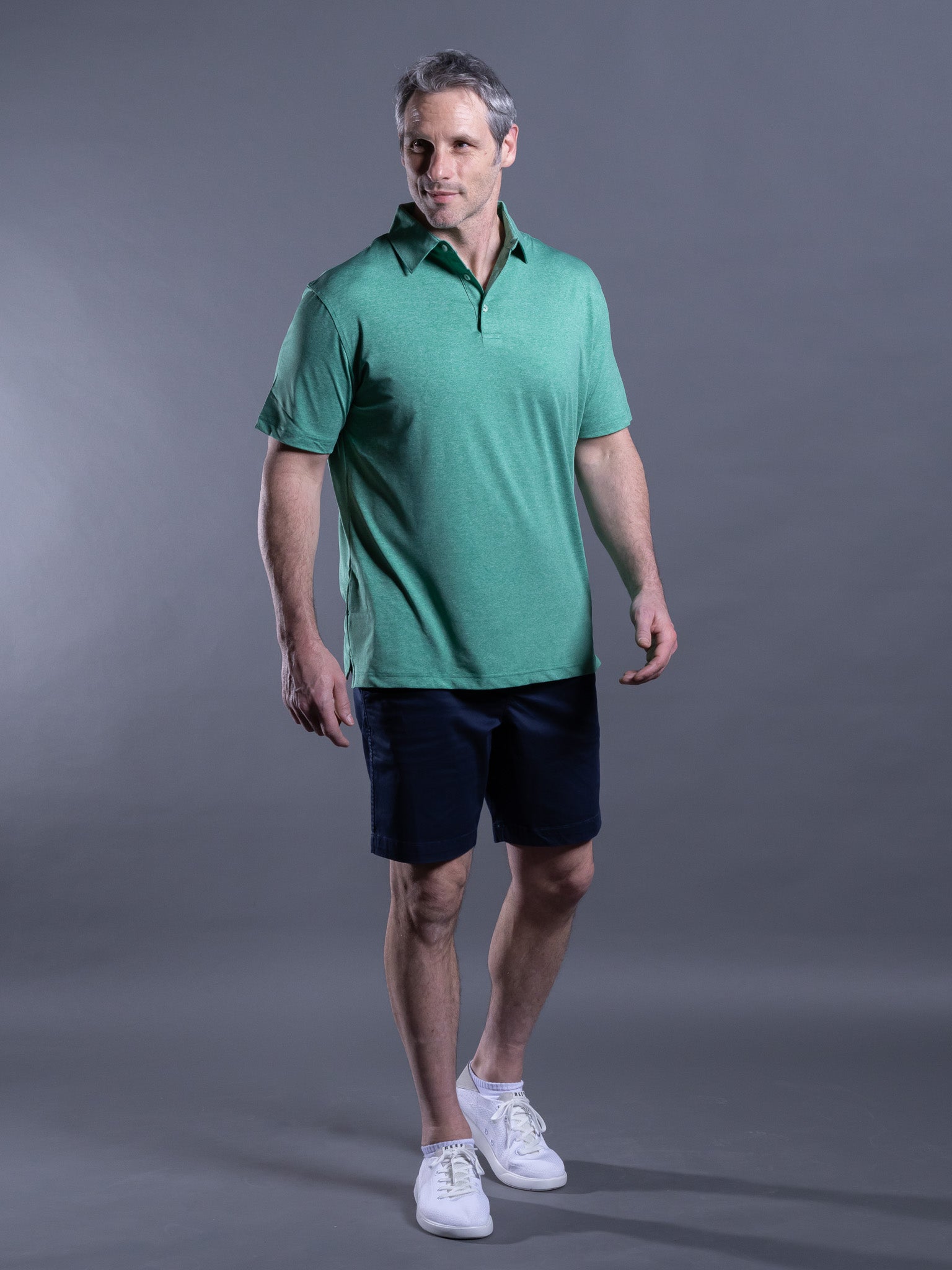 The Evergreen Heather Golf Polo in Green combines style and performance with a lightweight, moisture-wicking blend of 92% polyester and 8% spandex. Designed for all-day comfort, it features 4-way stretch for unrestricted movement and UPF 50+ protection against harmful UV rays. Its modern fit offers a sleek, polished look, making it perfect for both the golf course and casual outings. Durable, breathable, and easy to maintain, this polo ensures effortless style and flexibility wherever you go.